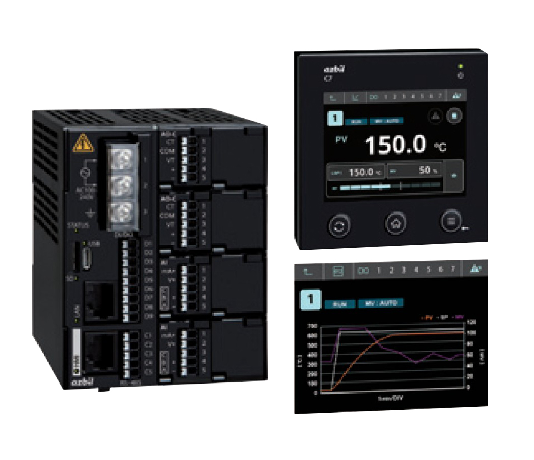 C7G是新型多通道图形化显示调节器,最多可以控制4个通道,由本体和显示屏组成。显示屏分体式安装(也有一体化机型),可单独或集中进行数值显示、柱形图显示及趋势显示。