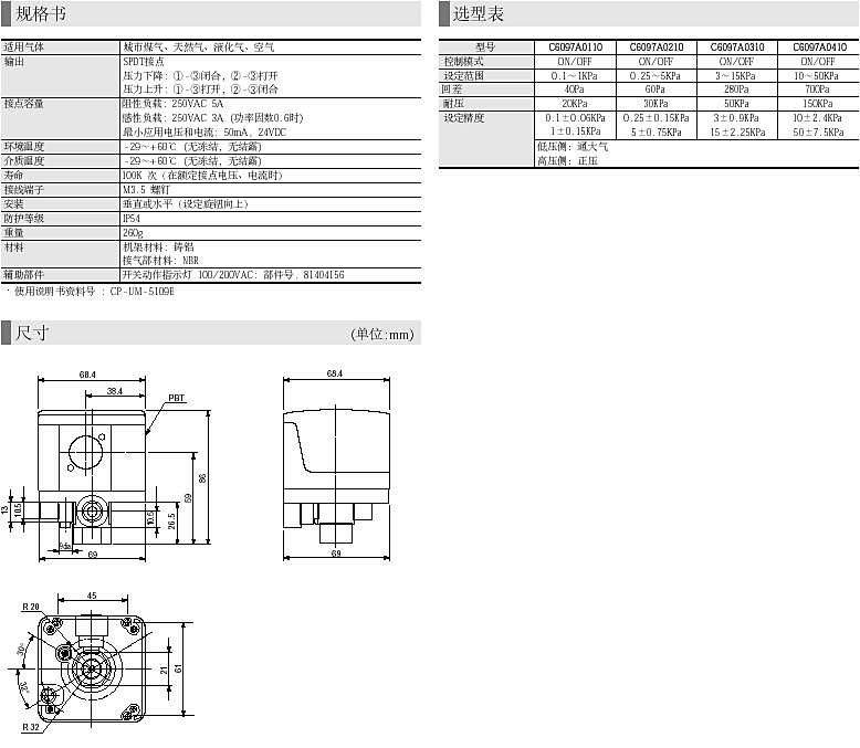 C6097A气体压力开关用于测量城市煤气、天然气、液化气及空气等气体的压力。气压开关根据用户的设定点执行ON/OFF动作,以控制外部电器设备。此开关广泛用于测量燃烧系统中的燃料气和空气的上下限,或作为燃烧允许运行的连锁点。