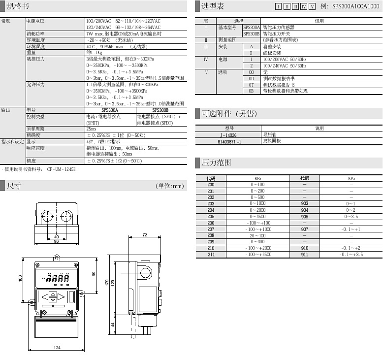 SPS300A/B高精度,高机能型数字压力检测器,以一个具有封入液的双重隔膜(SUS316L)和一个半导体压力传感元件作为压力的传感部分,用于测量容器内的压力。SPS300A输出一个电流信号和一个继电器接点信号,SPS300B输出二个独立的继电器接点信号。
